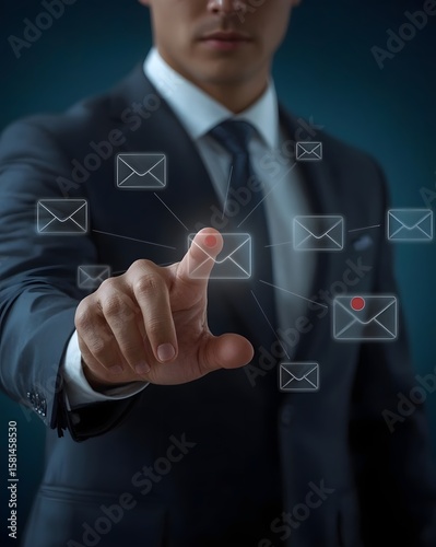 Businessman in a suit touching virtual envelope icons with notification symbols, symbolizing corporate email communication, message alerts, and digital contact in modern business.