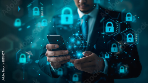 businessman in a suit using his smartphone, surrounded by digital padlock symbols on the screen, symbolizing data security and cyber protection