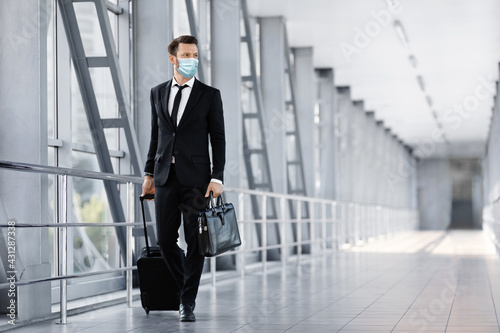 Businessman in face mask walking by airport terminal