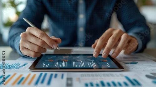 Businessman in office studying cost efficiency graphs on tablet, financial strategy, photorealistic focus