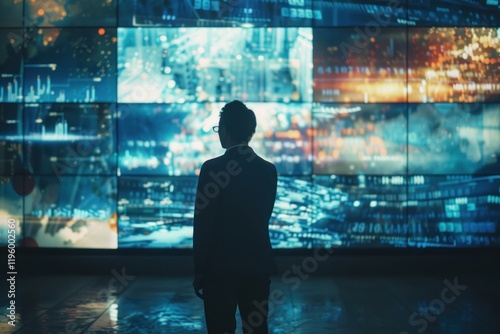 Businessman in rear view studying digital data displays with cityscape overlay