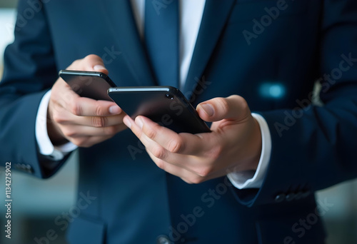 businessman in suit holding two smartphones, engaged in online transactions. focus is on modern technology and communication