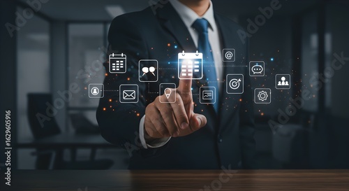 Businessman in suit interacts with a digital interface displaying calendar, chart, and communication icons, symbolizing planning and technology.