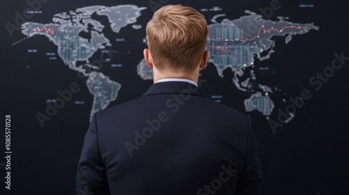 businessman in suit observes digital screens displaying world map, analyzing data trends and market movements with focus and determination
