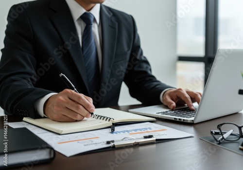 Businessman in suit working at desk with laptop, notebook, pen, and documents in a bright office