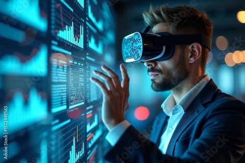Businessman in Virtual Reality: Analyzing Financial Data with Futuristic Holographic Technology