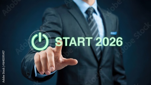Businessman initiates future success, pressing start on 2026 with glowing digital interface.