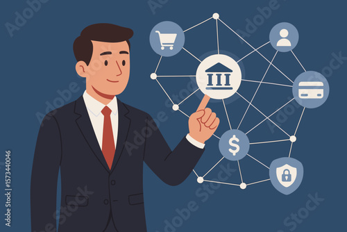 Businessman interacting with a digital banking interface. Concept for fintech, online payments, e-commerce, secure financial transactions, customer network, and investment services.