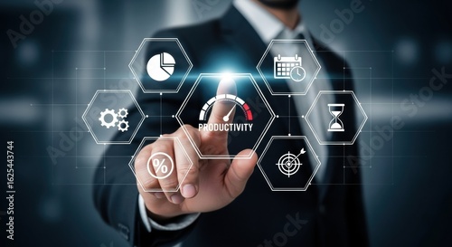 Businessman interacting with a futuristic digital dashboard displaying business analytics and performance indicators