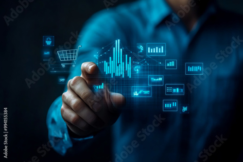 Businessman interacting with a growth graph, shopping cart icon, and bar chart on a virtual sales screen.