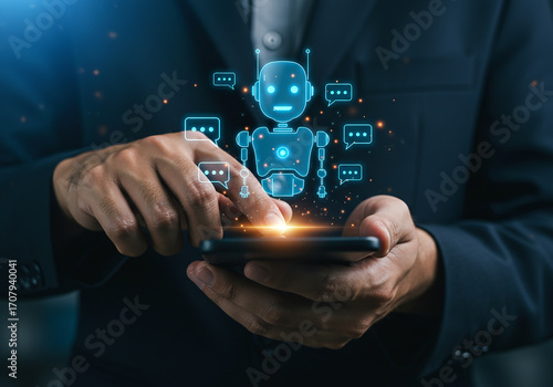 Businessman interacting with AI chatbot on smartphone, modern tech communication concept