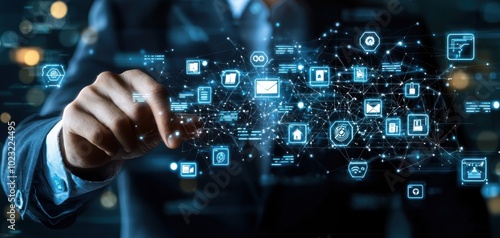 Businessman interacting with digital interface, black background
