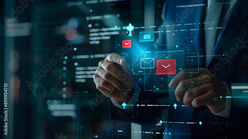 Businessman Interacting with Futuristic Augmented Reality Interface with Email and Notification Icons