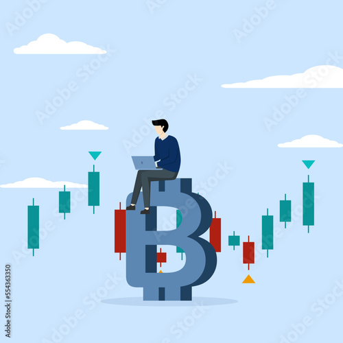 businessman investor using computer to trade crypto in big Bitcoin with candlestick price chart chart, Bitcoin and cryptocurrency investment, crypto trading make profit and income from Bitcoin price.
