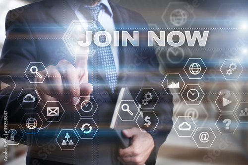 Businessman is pressing on the virtual screen and selecting "Join now".