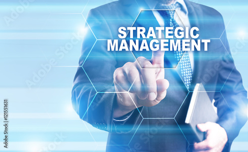 Businessman is pressing on the virtual screen and selecting "Strategic management".