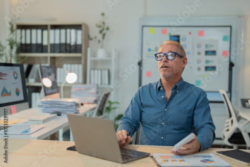 Businessman is sitting at his desk in the office, working on a laptop and reviewing financial documents, analyzing charts and graphs, and developing a new marketing strategy