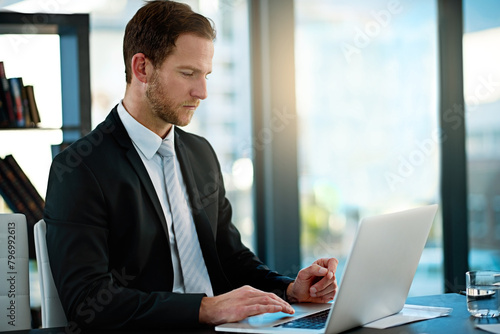 Businessman, laptop and office for working, research and internet for online email. Data broker, technology and professional workplace for social network, clients and company employee or manager