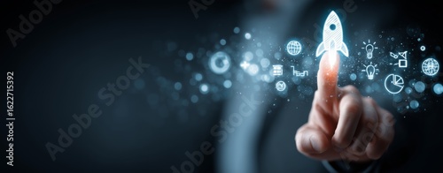 Businessman launching a digital rocket with innovative icons in a dark background.