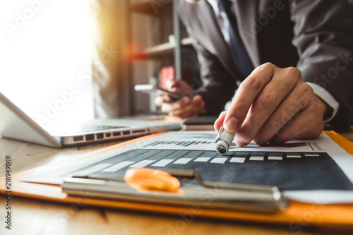 Businessman making presentation with his colleagues and business tablet digital computer at the office as concept in morning light