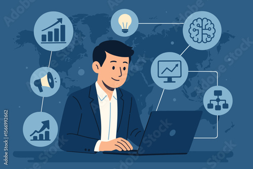Businessman managing digital marketing strategy with laptop. Data science analysis for business growth. Concept of AI, algorithm, global development, and technology solutions.
