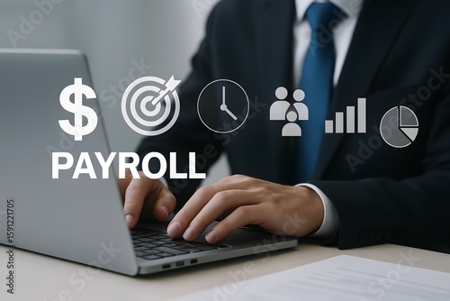 Businessman managing payroll system on a laptop, with floating icons representing financial management, salary payments, tax calculation, and digital payment solutions for business operations.