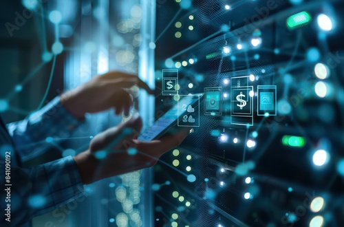 businessman multitasks with a smartphone and virtual money icon, symbolizing online business innovation, against a server room backdrop