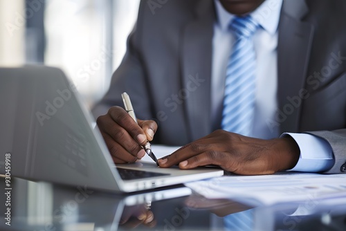 businessman or professional working at a desk in an office setting, using a laptop computer