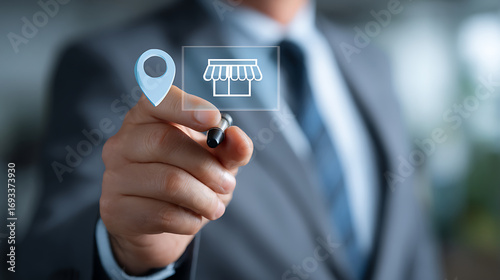 Businessman pointing at virtual store icon with location pin symbol, representing digital marketing and business growth