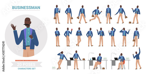 Businessman poses infographic vector illustration set. Cartoon business office worker man with mustache showing different gestures, manager working with laptop, posture collection isolated on white