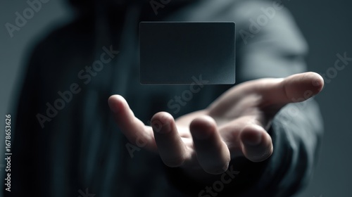 Businessman presenting a virtual credit card floating above his open hand, showcasing innovative payment technology in augmented reality interface