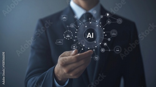 Businessman presenting ai technology interface network with digital icons and symbols in futuristic setting for innovation and digital transformation