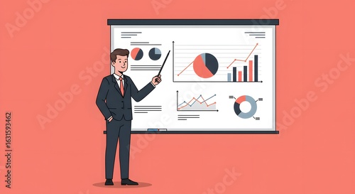 Businessman Presenting Financial Data on Whiteboard with Graphs