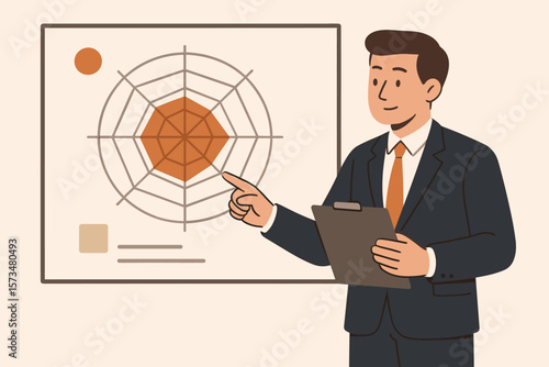 Businessman presenting performance review. Employee evaluation and skill assessment. HR concept for job candidate appraisal and competency analysis with radar chart metric.