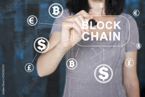 Businessman presses button blockchain currency on virtual electronic user interface.