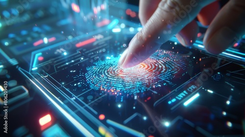 Businessman presses finger to identify fingerprint, innovative technology, digital cyber security. Security of personal data.