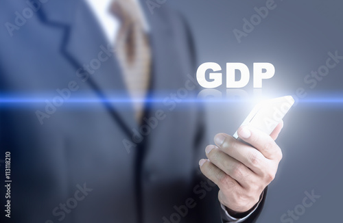 Businessman pressing hand gdp message on virtual screen. Can bring to the medium of your ad.