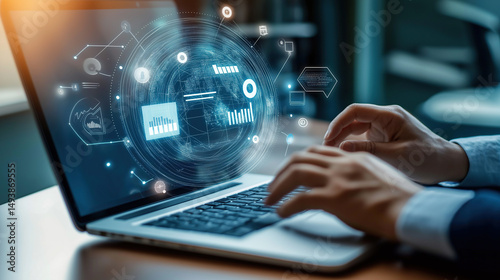 businessman pressing virtual button on laptop - connectivity and AI concept
