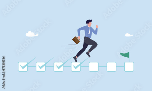 Businessman project manager running on completed checkbox to reach goal, project management, task tracking or work progress, tracking finish or completed tasks, planning or productivity concept.