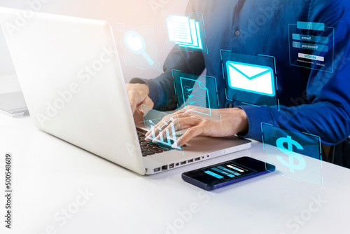 Businessman searching and verifying the correctness of document information.,Management of financial system management and customer information via email.
