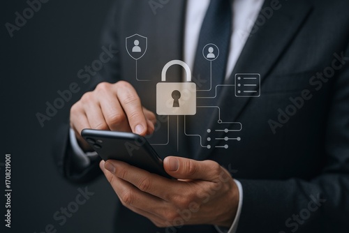 Businessman securing data on his smartphone with a digital padlock for data protection