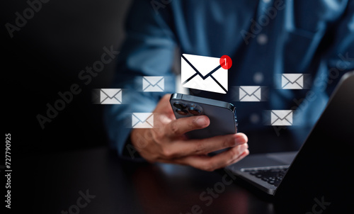 Businessman sending email by laptop computer to customer, business contact and communication, email icon, email marketing concept, send e-mail or newsletter, online working internet network.