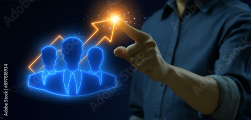 Businessman showing group of businessman icon with an arrow up behind. Concept for teamwork cooperate together to business achievement.