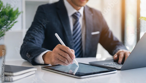 businessman signs digital contract with stylus pen on tablet, symbolizing modern, efficient business transactions