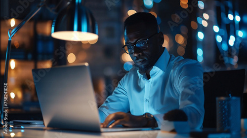 Businessman sitting in office, work on laptop on analyzing, analytic.