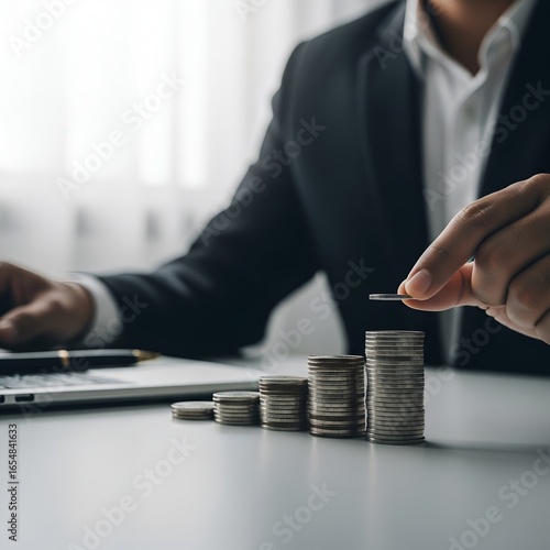 Businessman stacking coins in increasing order on a desk with a laptop and pen