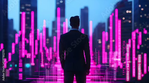 Businessman Standing in Urban Landscape with Neon Data Visualization
