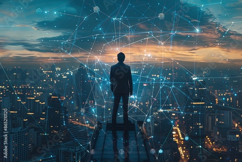 Businessman standing on top of building overlooking city skyline with digital network connections. Concepts. technology, business, future, innovation, success.