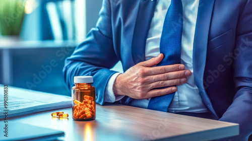 Businessman suffering stomach ache holding hand on painful abdomen at work
