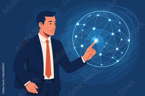 Businessman touches a glowing global network structure. AI, machine learning, big data concept. Internet technology for digital communication, information exchange and innovation.
